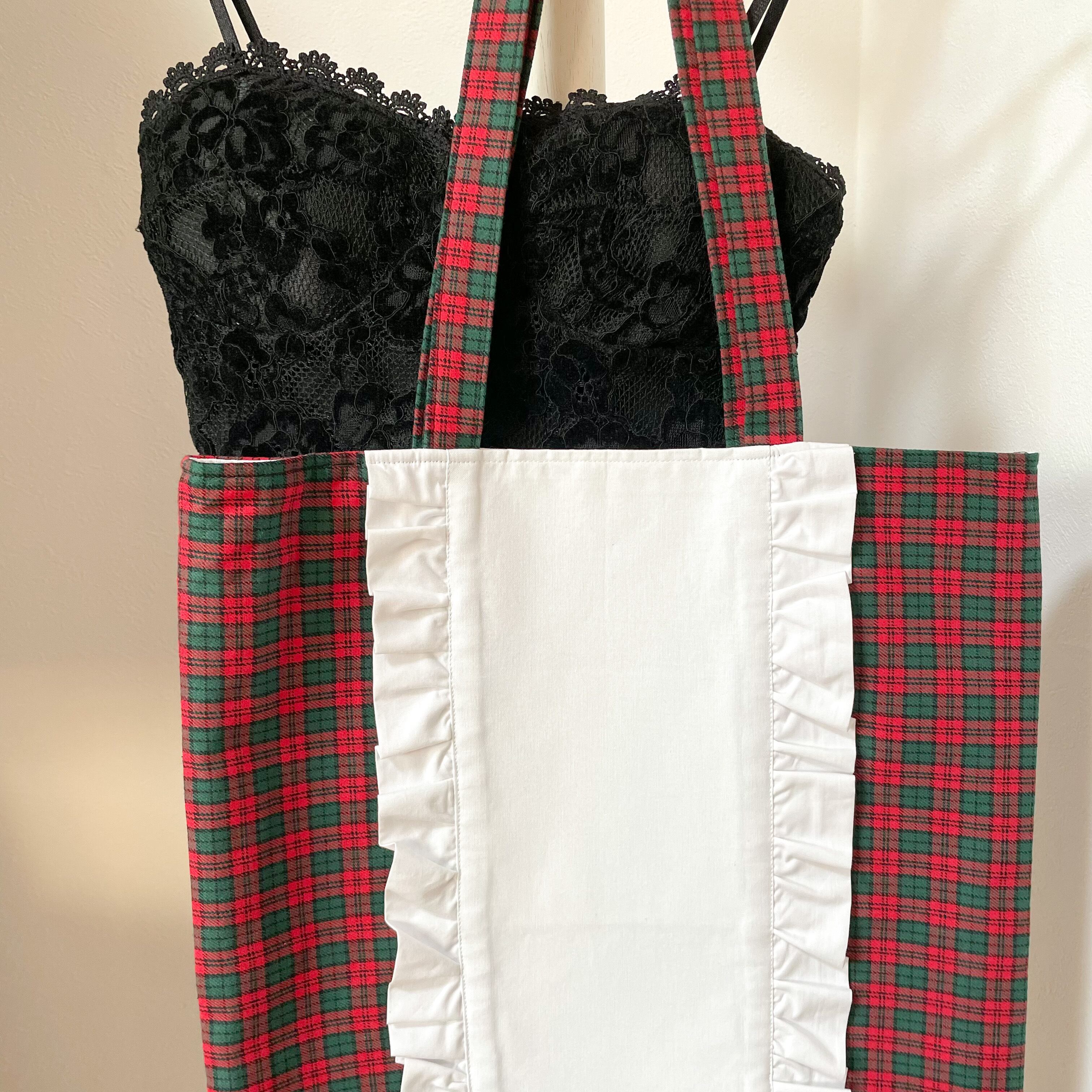 チェック × フリルで甘さを出したトートバッグ♡*゜